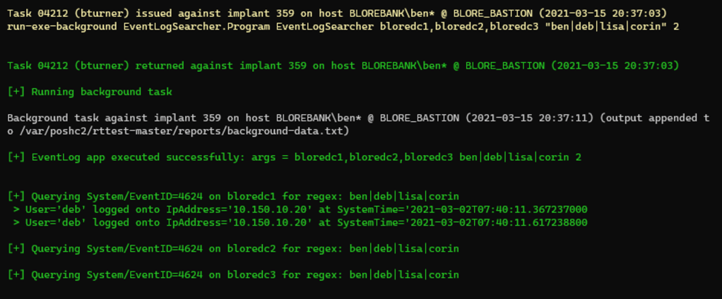 EventLogSearcher.exe bloredc1,bloredc2,bloredc3 “ben|deb|lisa|corin” 2